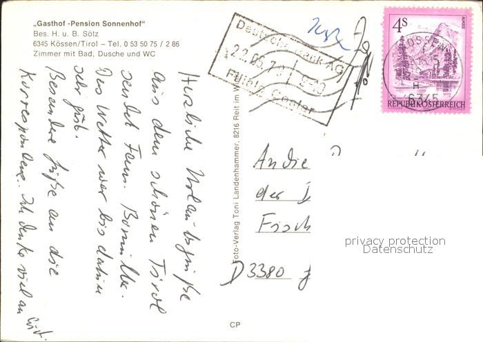 72012877 alte Postkarte Koessen Tirol Gasthof Pension Sonnenhof postalisch gelaufen Erhaltung siehe scans KatCode: 11390335070412