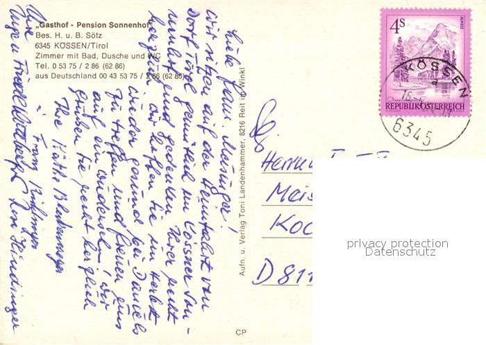 13317695 alte Postkarte Koessen Tirol Gasthof Pension Sonnenhof postalisch gelaufen Erhaltung siehe scans [WerneD78] KatCode: 11390335070412
