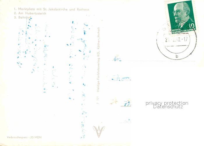72818262 alte Postkarte Koethen Anhalt Marktplatz St. Jakobskirche Hubertusteich Bahnhof postalisch gelaufen Erhaltung siehe scans [LiesaD40] KatCode: 11110015082180