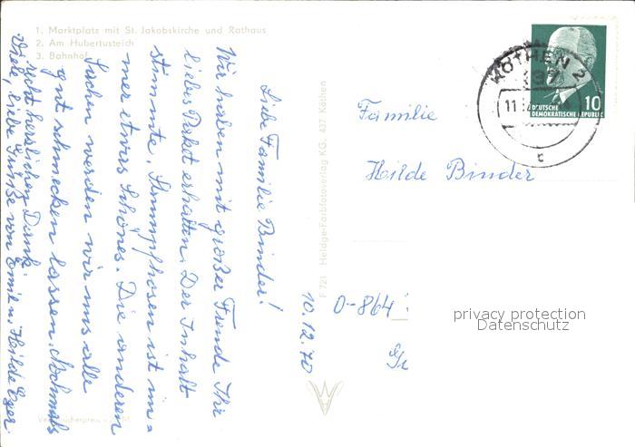 72035289 alte Postkarte Koethen Anhalt Marktplatz St Jakobskirche Rathaus Hubertusteich Bahnhof postalisch gelaufen Erhaltung siehe scans KatCode: 11110015082180