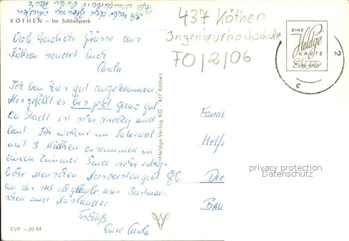 72167117 alte Postkarte Koethen Anhalt Schlosspark Bruecke Schwaene postalisch gelaufen Erhaltung siehe scans KatCode: 11110015082180