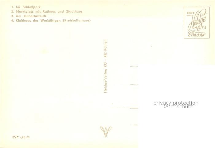 73750190 Koethen Anhalt Schlosspark Marktplatz Rathaus Stadthaus Hubertusteich Klubhaus der Werktaetigen Kreiskulturhaus postalisch nicht gelaufen Erhaltung siehe scans [FriedD77] KatCode: 11110015082180