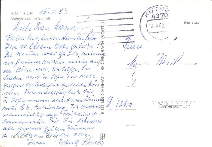 72115956 alte Postkarte Koethen Anhalt Spiegelsaal Schloss postalisch gelaufen Erhaltung siehe scans KatCode: 11110015082180