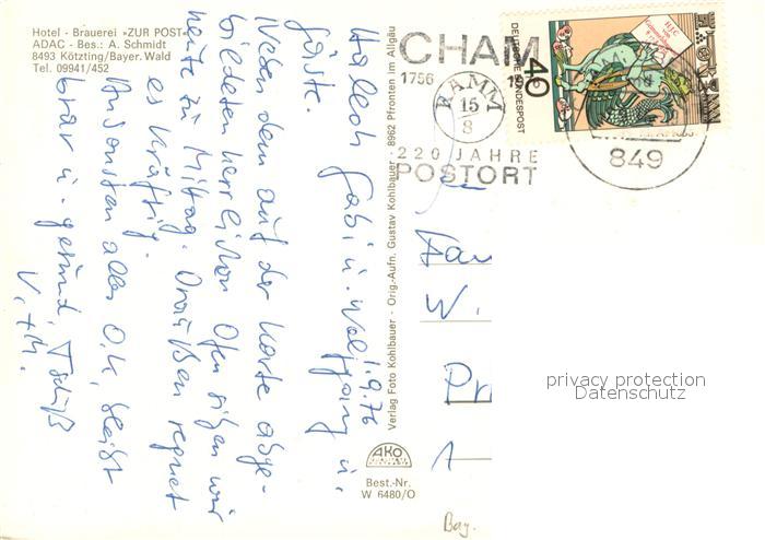 73648980 alte Postkarte Koetzting Hotel Brauerei Zur Post Restaurant Panorama postalisch gelaufen Erhaltung siehe scans [FriedD77] KatCode: 11110009372137