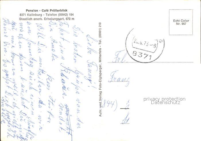 72071631 alte Postkarte Kollnburg Cafe Pension Proellerblick Gaststube Panorama postalisch gelaufen Erhaltung siehe scans KatCode: 11110009276128