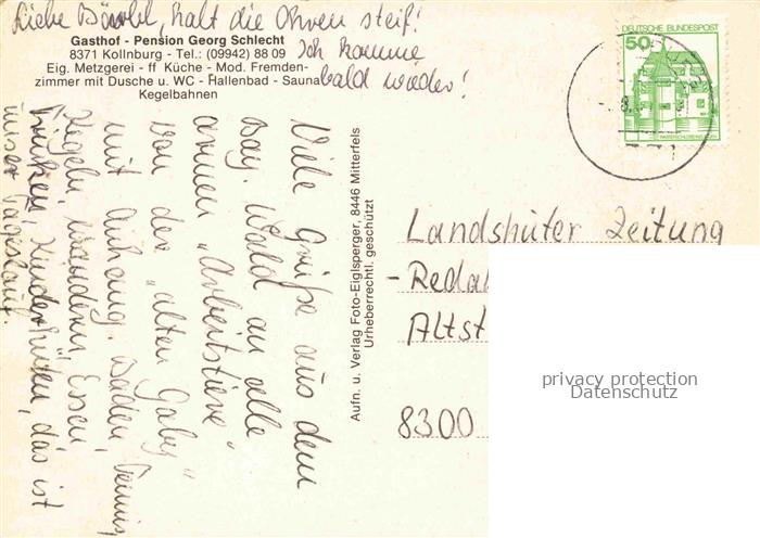 74035095 alte Postkarte Kollnburg Panorama Erholungsort Gasthof Pension Schlecht Freibad postalisch gelaufen Erhaltung siehe scans [FriedD77] KatCode: 11110009276128
