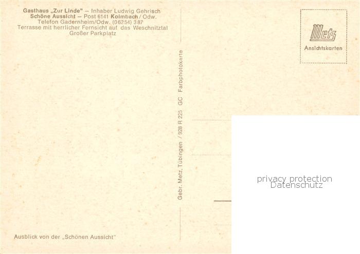 73843956 Kolmbach Bensheim Gasthaus Zur Linde Schoene Aussicht postalisch nicht gelaufen Erhaltung siehe scans [WerneD78] KatCode: 11110006431015