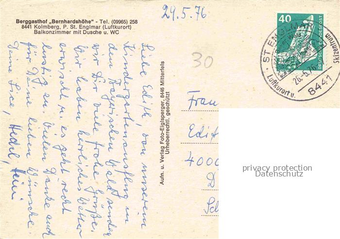 74100321 alte Postkarte Kolmberg Sankt Englmar Berggasthof Bernhardshoehe im Bayerischen Wald Restaurant Hallenbad postalisch gelaufen Erhaltung siehe scans [FriedD77] KatCode: 11110009278184