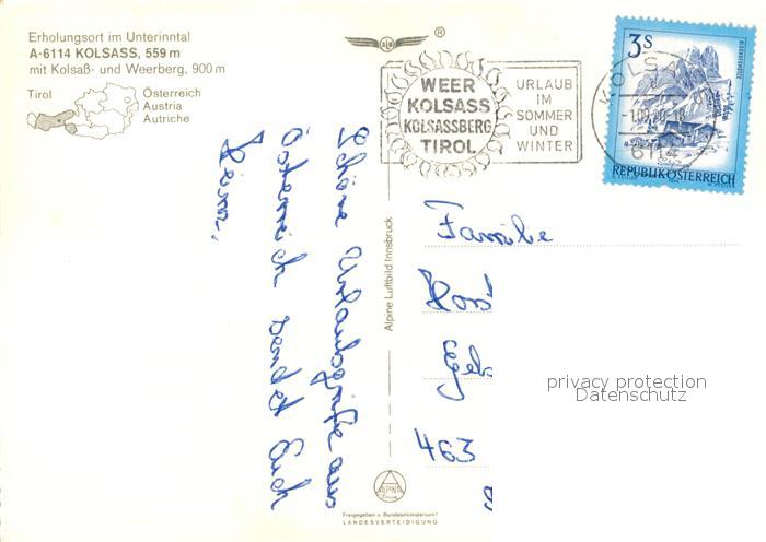 13220383 alte Postkarte Kolsass Fliegeraufnahme im Unterinntal mit Weerberg postalisch gelaufen Erhaltung siehe scans [LiesaD40] KatCode: 11390332070322