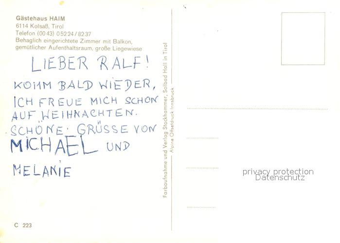 13210813 Kolsass Gaestehaus Haim postalisch nicht gelaufen Erhaltung siehe scans [LiesaD40] KatCode: 11390332070322