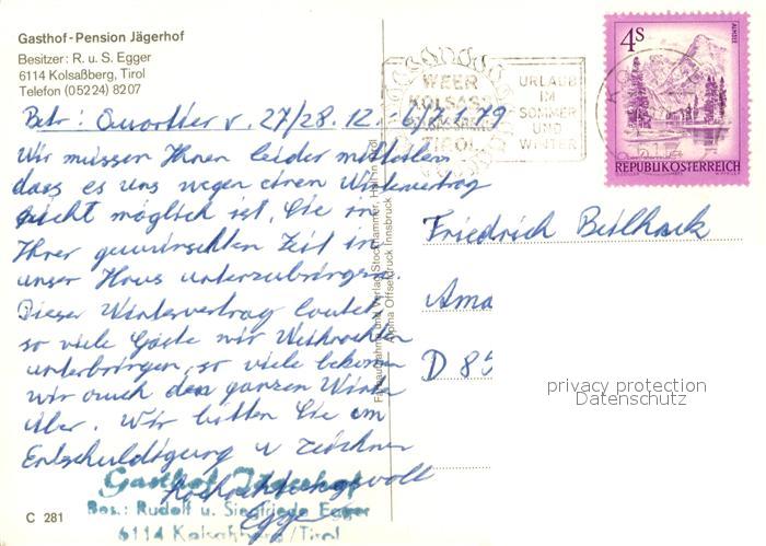 73588225 alte Postkarte Kolsassberg Gasthof Pension Jaegerhof Landschaftspanorama Alpen postalisch gelaufen Erhaltung siehe scans [FriedD77] KatCode: 11390332070323
