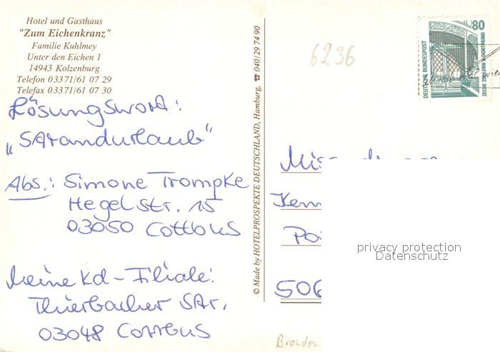 73659713 alte Postkarte Kolzenburg Hotel Gasthaus Zum Eichenkranz Terrasse postalisch gelaufen Erhaltung siehe scans [FriedD77] KatCode: 11110012072232