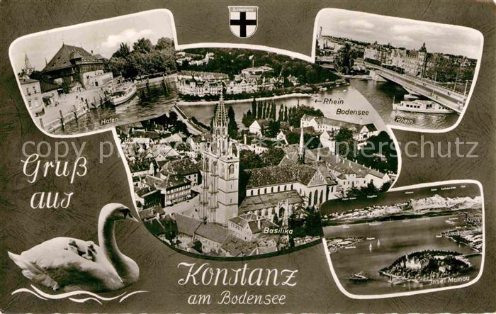 72843131 alte Postkarte Konstanz Bodensee Hafen Basilika Insel Mainau Alpen Fliegeraufnahme Schwan postalisch gelaufen Erhaltung siehe scans [FriedD77] KatCode: 11110008335043