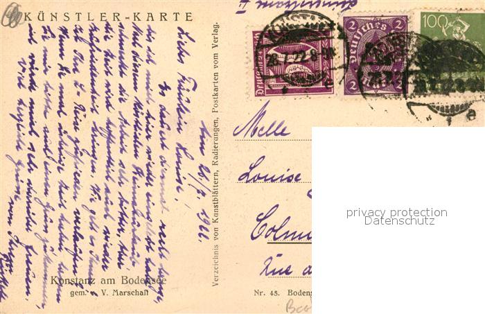 43491620 alte Postkarte Konstanz Bodensee Panorama Kuenstler Marschall postalisch gelaufen Erhaltung siehe scans [KathaD81] KatCode: 11110008335043