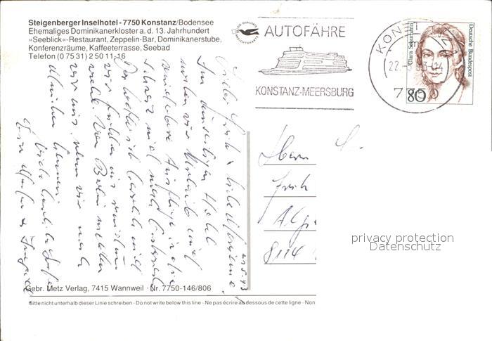 72549695 alte Postkarte Konstanz Bodensee Steigenberger Inselhotel postalisch gelaufen Erhaltung siehe scans [AndreD76 kv022box] KatCode: 11110008335043