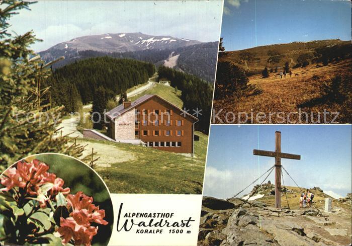 72495881 alte Postkarte Koralpe Alpengasthof Waldrast Panorama Gipfelkreuz Alpenflora postalisch gelaufen Erhaltung siehe scans KatCode: 11390