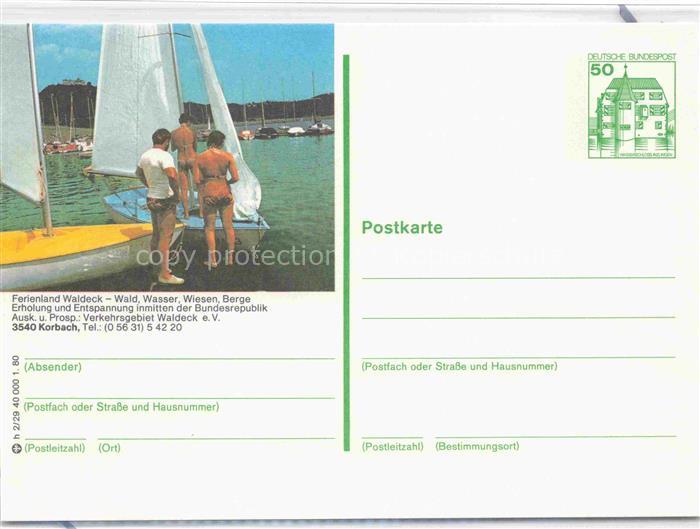 74123201 Korbach Corbach Waldeck Hessen Ferienland Waldeck Segeln auf dem Edersee postalisch nicht gelaufen Ganzsache (eingedruckte Briefmarke) Erhaltung siehe scans [FriedD77] KatCode: 11110006635015