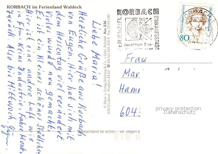 73241203 alte Postkarte Korbach Marktplatz M. Pranger Dalwigker-Strasse Hartwigsches-Haus Klosterschule Kirchstrasse Obermarkt postalisch gelaufen Erhaltung siehe scans [LiesaD40] KatCode: 11110006635015