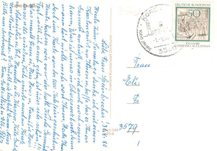 73935515 alte Postkarte Korbach Stadtzentrum Enser Tor Krankenhaus Freilichtbuehne Stechbahn Fussgaengerzone Freibad Altenheim postalisch gelaufen Erhaltung siehe scans [FriedD77] KatCode: 11110006635015