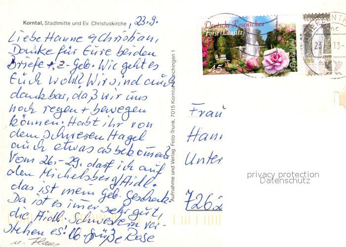 72971501 alte Postkarte Korntal Stadtmitte und ev Christuskirche postalisch gelaufen Erhaltung siehe scans [FriedD77] KatCode: 11110008118080