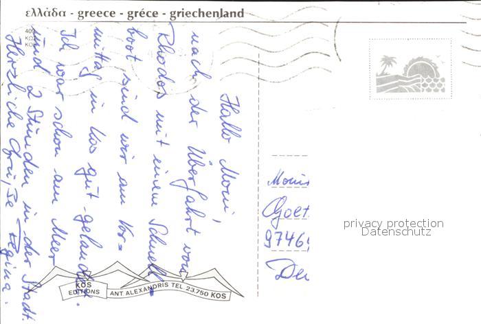 old postcard Kos Cos Hafen Palmen Allee Blumen postalisch gelaufen Erhaltung siehe scans