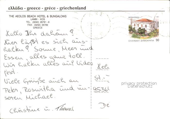 old postcard Kos Cos Hotel Bugalows Aeolos Beach Lambi postalisch gelaufen Erhaltung siehe scans