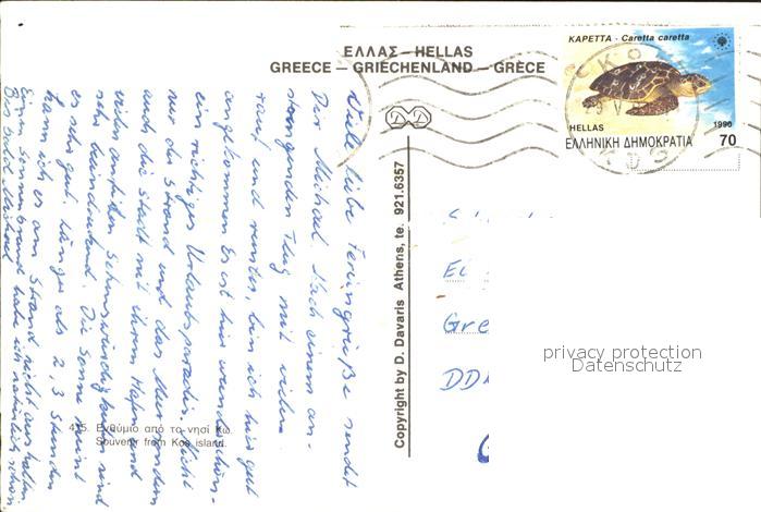 old postcard Kos Cos Teilansichten Hafen Fischkutter Tempel Ruine Antike postalisch gelaufen Erhaltung siehe scans