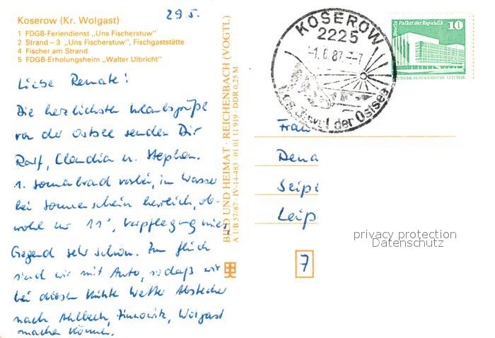 73100487 alte Postkarte Koserow Ostseebad Usedom FDGB Feriendienst Uns Fischerstuw Strand Fischgaststaette postalisch gelaufen Erhaltung siehe scans [KathaD81] KatCode: 11110013059044
