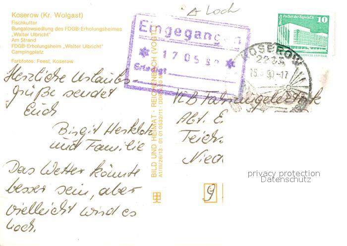 72655925 alte Postkarte Koserow Ostseebad Usedom Fischkutter Bungalowsiedlung Walter Ulbricht Strand Camping postalisch gelaufen Erhaltung siehe scans [LiesaD40] KatCode: 11110013059044