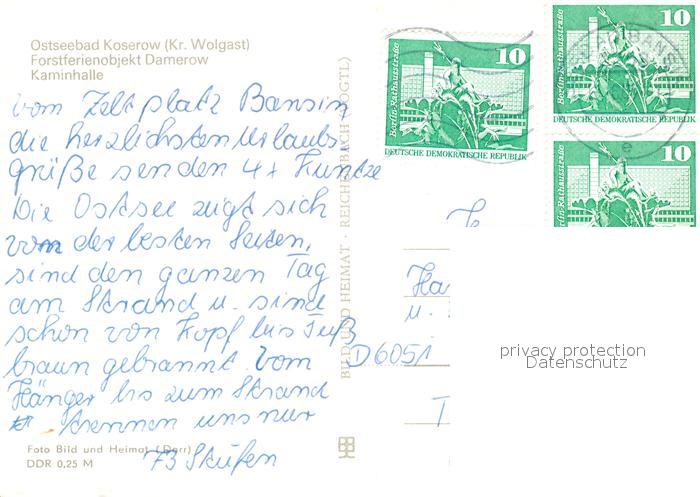 73334692 alte Postkarte Koserow Ostseebad Usedom Forstferienobjekt Damerow Kaminhalle postalisch gelaufen Erhaltung siehe scans [FriedD77] KatCode: 11110013059044