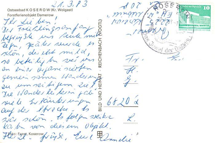 73895283 alte Postkarte Koserow Ostseebad Usedom Forstferienobjekt Damerow postalisch gelaufen Erhaltung siehe scans [WerneD78] KatCode: 11110013059044