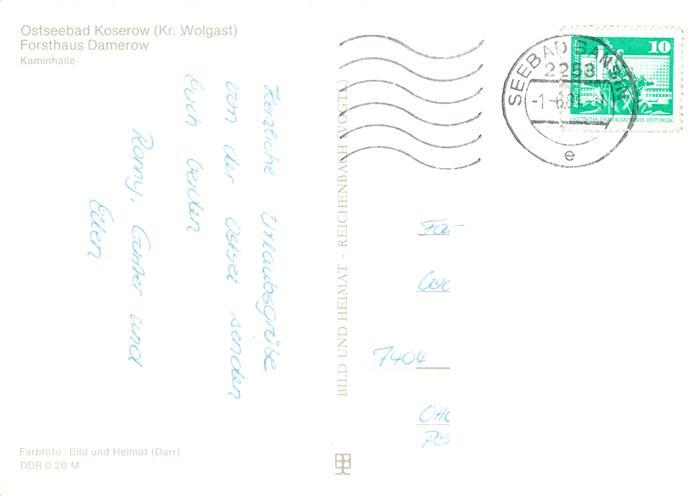 73946785 alte Postkarte Koserow Ostseebad Usedom Forsthaus Damerow Kaminhalle postalisch gelaufen Erhaltung siehe scans [FriedD77] KatCode: 11110013059044
