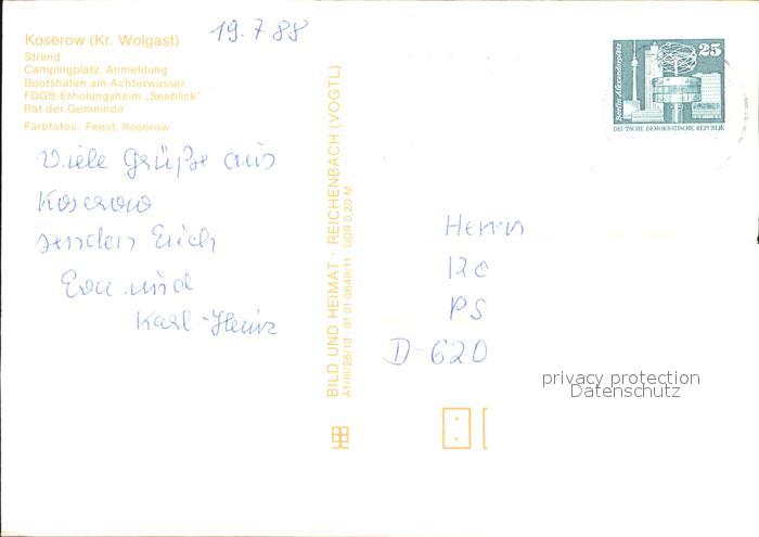 72550663 alte Postkarte Koserow Ostseebad Usedom Strand Campingplatz Bootshafen Achterwasser postalisch gelaufen Erhaltung siehe scans [KathaD79] KatCode: 11110013059044