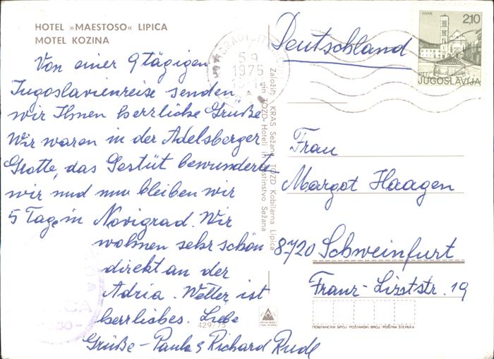old postcard Kozina Motel Hotel Maestoso Lipica Pferde postalisch gelaufen Erhaltung siehe scans