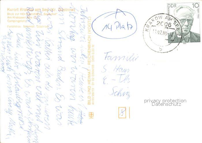 72331431 alte Postkarte Krakow See HO Gaststaette Seehotel Campingplatz postalisch gelaufen Erhaltung siehe scans KatCode: 11110013053043