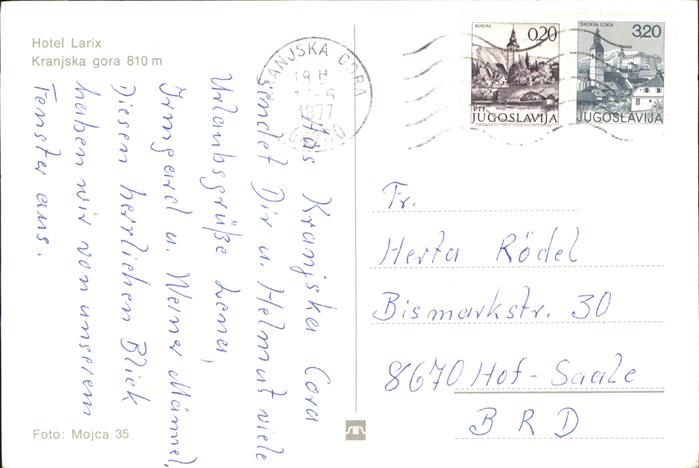 old postcard Kranjska Gora Hotel Larix mit Alpenblick postalisch gelaufen Erhaltung siehe scans