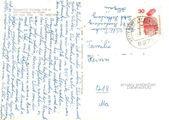 73636802 alte Postkarte Kranzegg Berggasthof Cafe Bergbahn Freibad Alphornblaeser Alpvieh Alpenrosen Gruentengipfel Allgaeuer Alpen postalisch gelaufen Erhaltung siehe scans [FriedD77] KatCode: 11110009780137