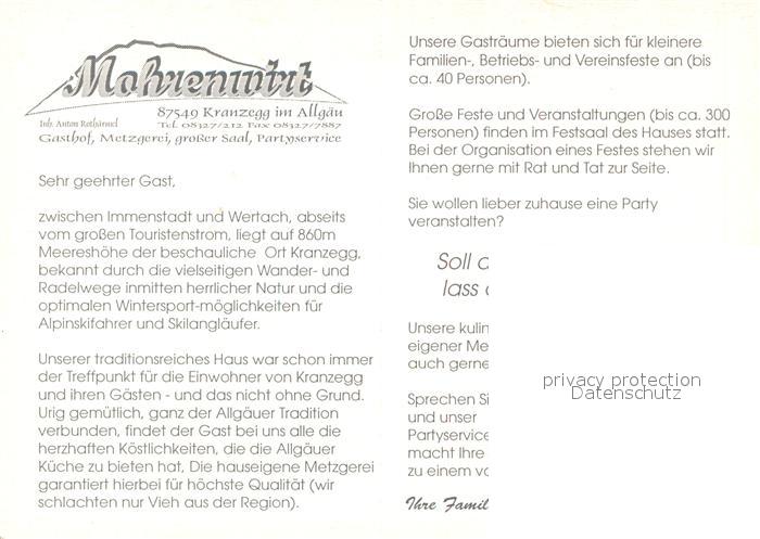 73367169 Kranzegg Mohrenwirt Gasthof Metzgerei grosser Saal Partyservice postalisch nicht gelaufen Werbekarte (keine Postkarte) Erhaltung siehe scans [WerneD78] KatCode: 11110009780137