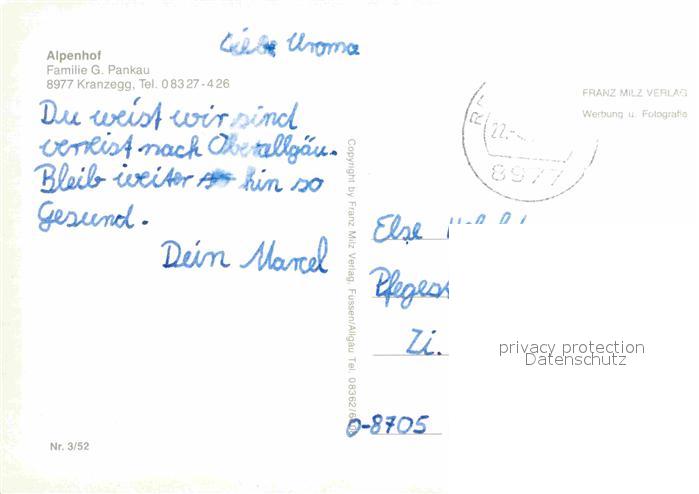 72717651 alte Postkarte Kranzegg Pension Restaurant Alpenhof postalisch gelaufen Erhaltung siehe scans [FriedD77] KatCode: 11110009780137