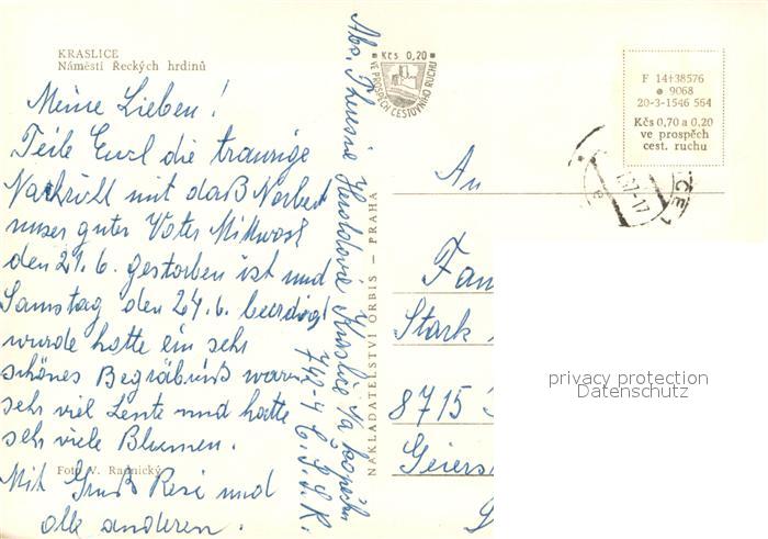 73740543 Kraslice Graslitz CZ Namesti Reckych hrdinu postalisch gelaufen Erhaltung siehe scans [WerneD78] old postcard Wern Katcode 11520