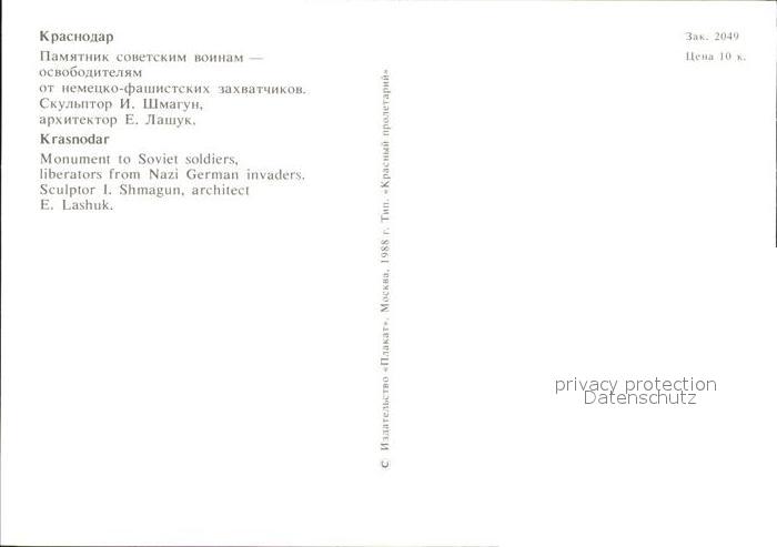 Krasnodar Monument to Soviet soldiers liberators from Nazi German postalisch nicht gelaufen Erhaltung siehe scans