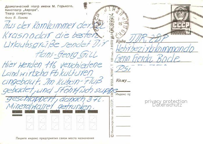 old postcard Krasnodar Theater postalisch gelaufen Ganzsache (eingedruckte Briefmarke) Erhaltung siehe scans [NatalD47]