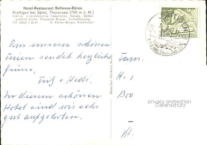 11640078 Krattigen Spiez Hotel-Restaurant Bellevue-Baeren postalisch gelaufen Erhaltung siehe scans Alte Ansichtskarte Postkarte alte Postkarte Paol Katcode 11470060170216