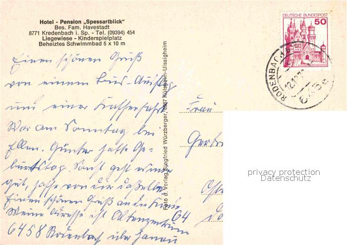 72786488 alte Postkarte Kredenbach Unterfranken Hotel Pension Spessartblick postalisch gelaufen Erhaltung siehe scans [AndreD76] KatCode: 11110009677126