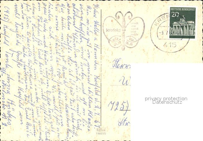 72522566 alte Postkarte Krefeld Rheinbruecke Burb Linn Weberschule Schoenwasserpark Stadttheater Ostwall postalisch gelaufen Erhaltung siehe scans KatCode: 11110005114000