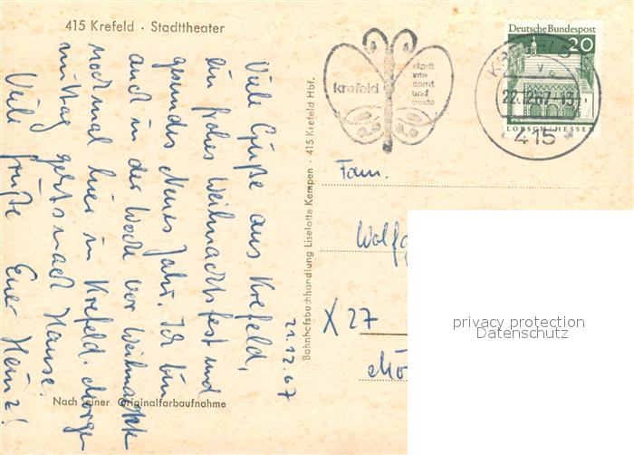 73617763 alte Postkarte Krefeld Stadttheater postalisch gelaufen Erhaltung siehe scans [WerneD78] KatCode: 11110005114000