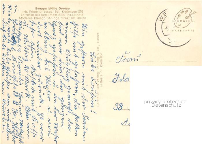 73845169 alte Postkarte Kreiensen Burggaststaette Greene Terrasse postalisch gelaufen Erhaltung siehe scans [WerneD78] KatCode: 11110003155008