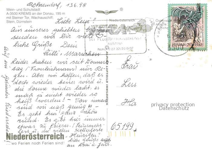 74027178 alte Postkarte Krems Donau Waldviertel Niederoesterreich AT Luftaufnahme Steiner Tor Wachauschiff Stein Duernstein postalisch gelaufen Erhaltung siehe scans [FriedD77] KatCode: 11390124030101