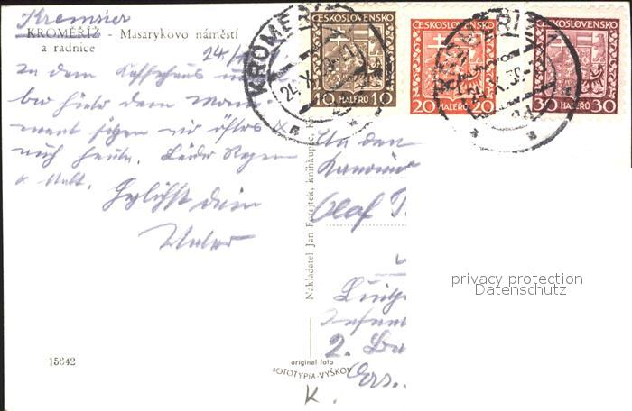 31738545 old postcard Kremsier Kromeriz Czechia Masarykovo namesti radnice postalisch gelaufen Erhaltung siehe scans KatCode: 11520