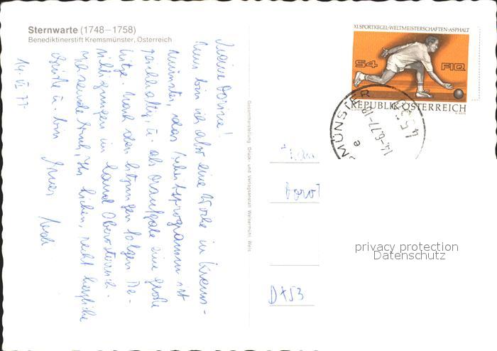 71959469 alte Postkarte Kremsmuenster Sternwarte Benediktinerstift postalisch gelaufen Erhaltung siehe scans KatCode: 11390314040907